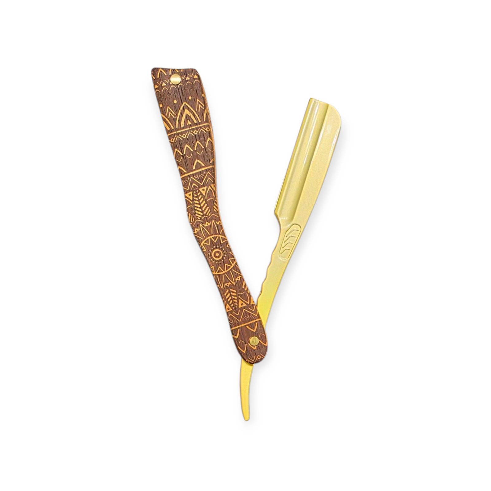 Unikatni dizajn – drvena ručka sa gravurom i luksuzno zlatno sečivo.