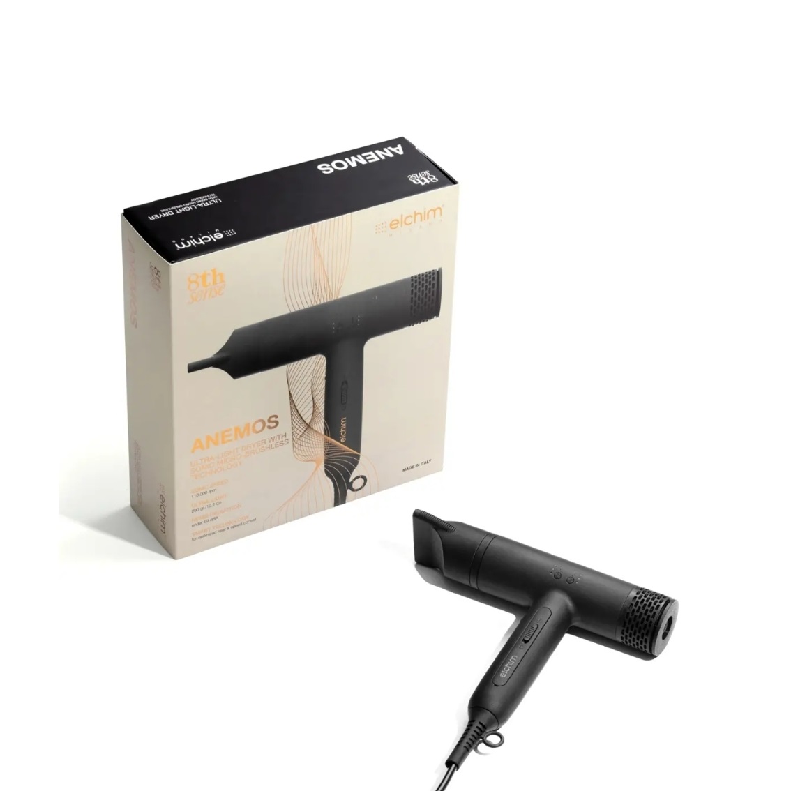 Elchim 8th Sense Anemos fen za kosu kombinuje snažan DC motor i naprednu jonsku i sonic tehnologiju za brzo sušenje i povećan sjaj kose. Zahvaljujući velikoj brzini motora i optimizovanom protoku vazduha, omogućava efikasno stilizovanje uz smanjenje statičkog elektriciteta i kontrolu friza.