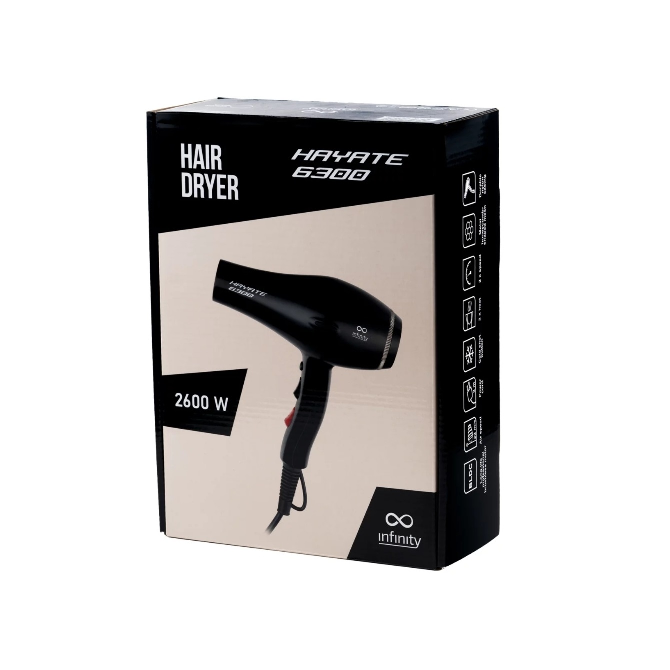 Infinity Hayate 6300 je moćan fen za kosu sa snagom od 2600 W i digitalnim motorom bez četkica (BLDC), koji pruža neverovatan protok vazduha od 79 km/h. Zahvaljujući snažnim performansama i ergonomskom dizajnu, idealan je za intenzivan rad u frizerskim i berberskim salonima. Pouzdan i lagan za korišćenje, kombinuje trajnost, funkcionalnost i elegantan izgled.