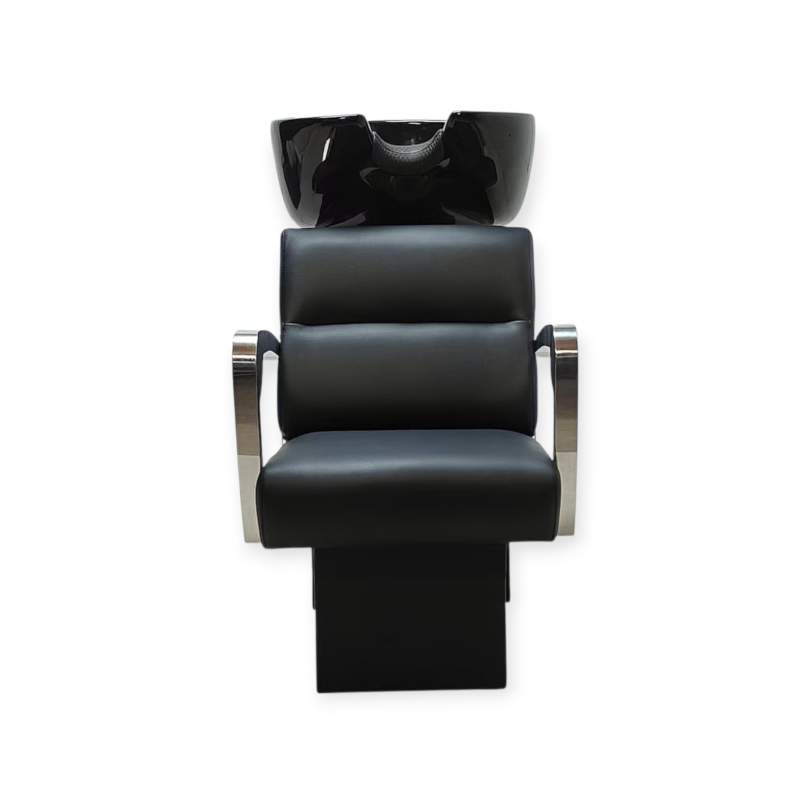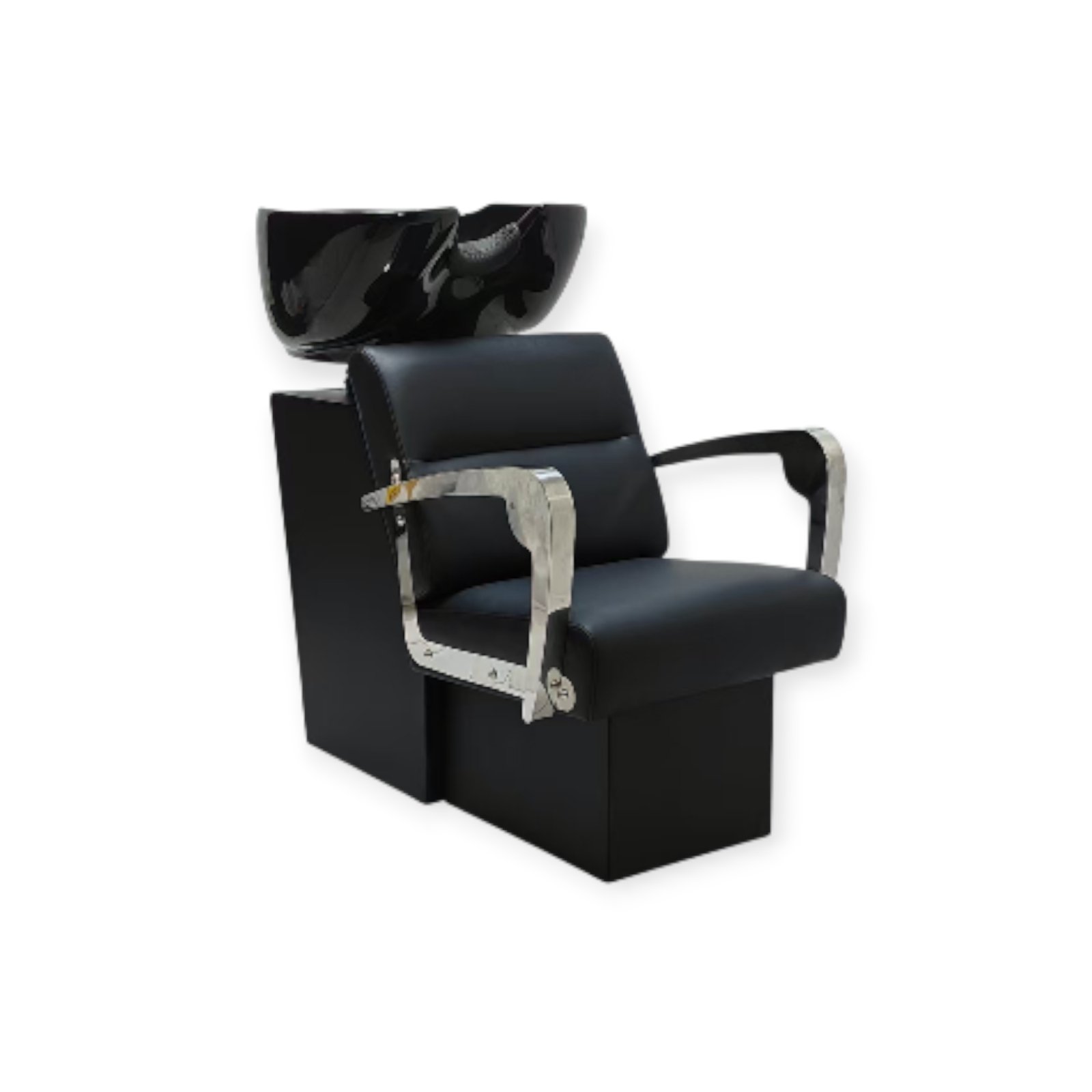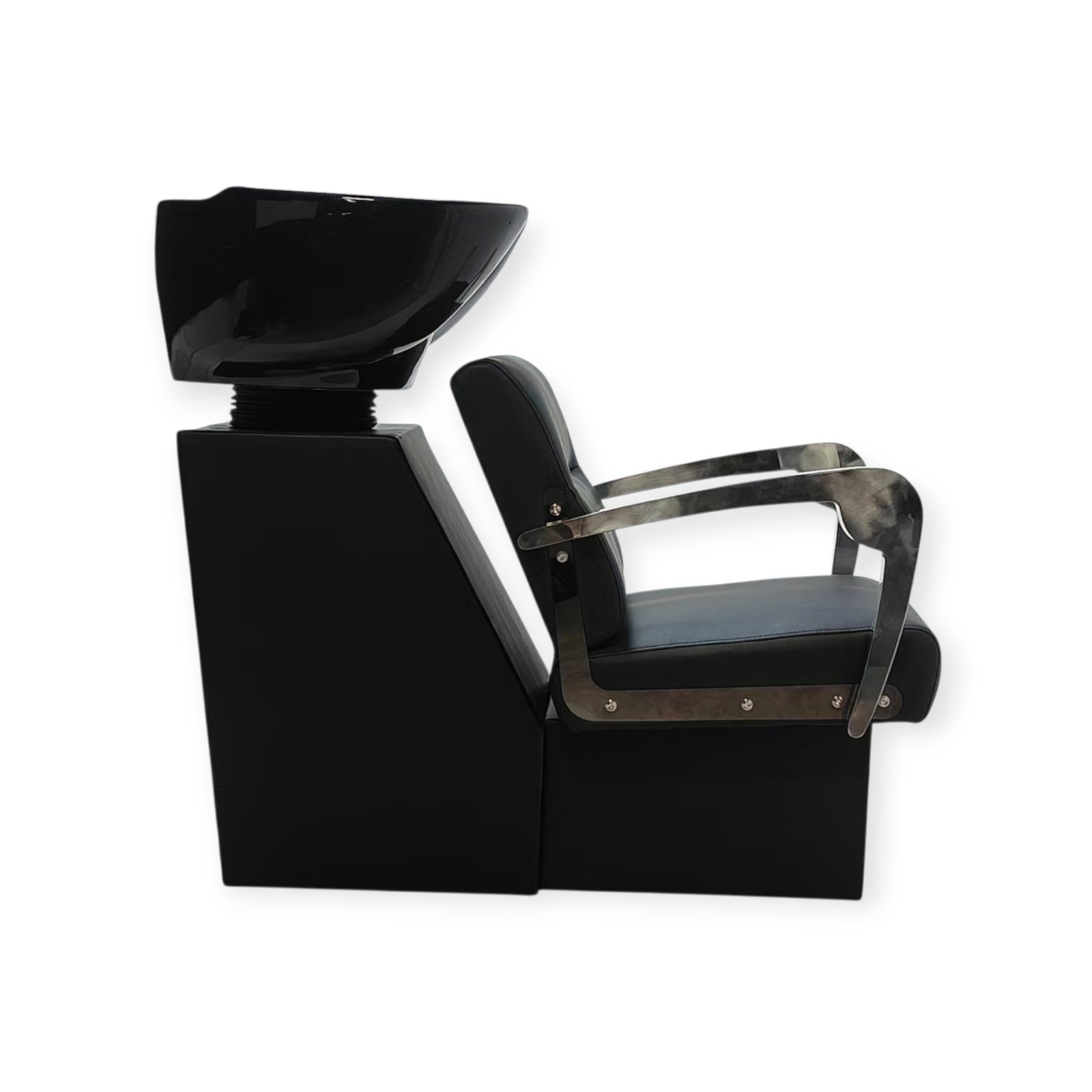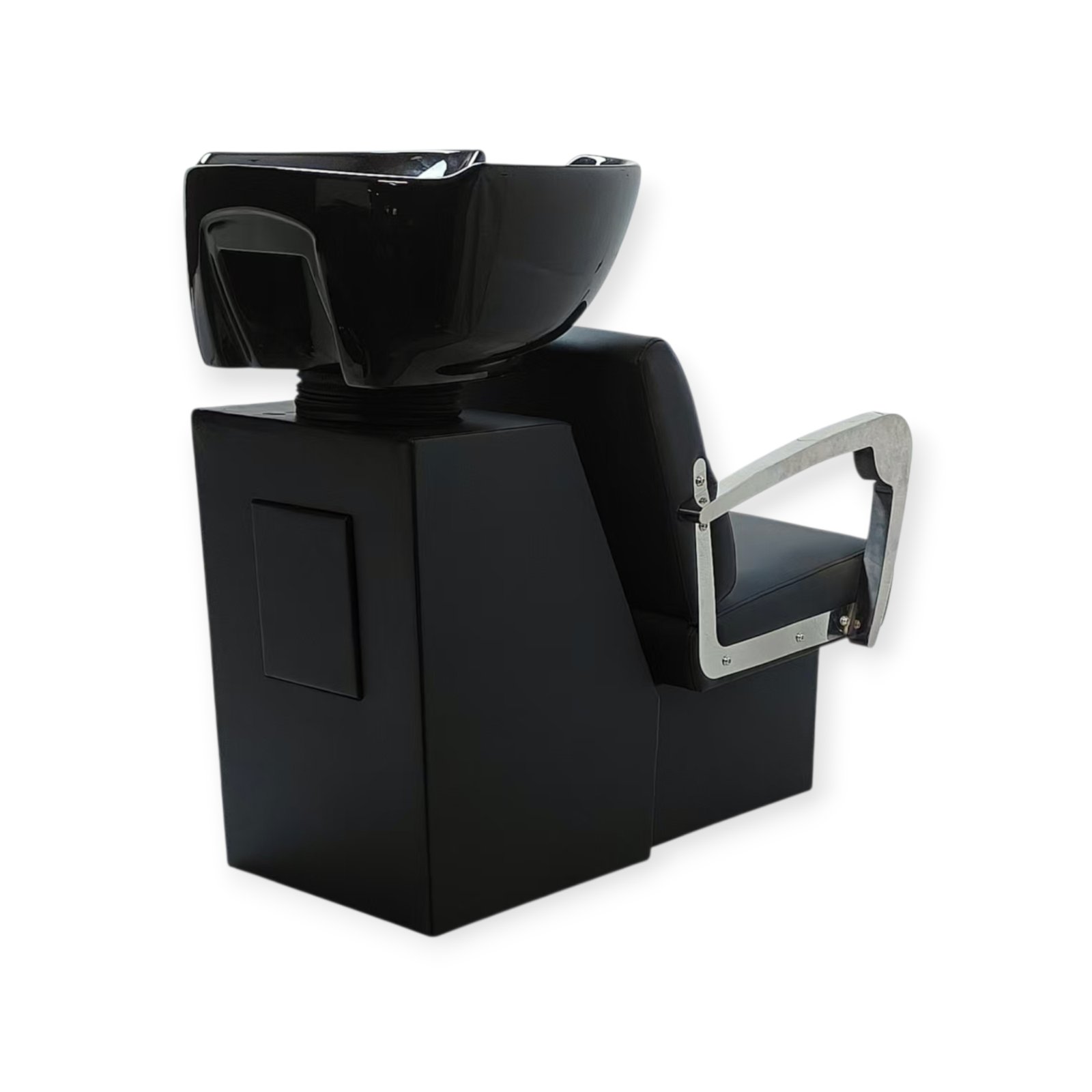 Crna keramička posuda sa dubokim profilom omogućava precizno i komforno pranje, dok metalni rukonasloni naglašavaju robustan karakter šamponjere i doprinose dugotrajnosti u intenzivnoj upotrebi.